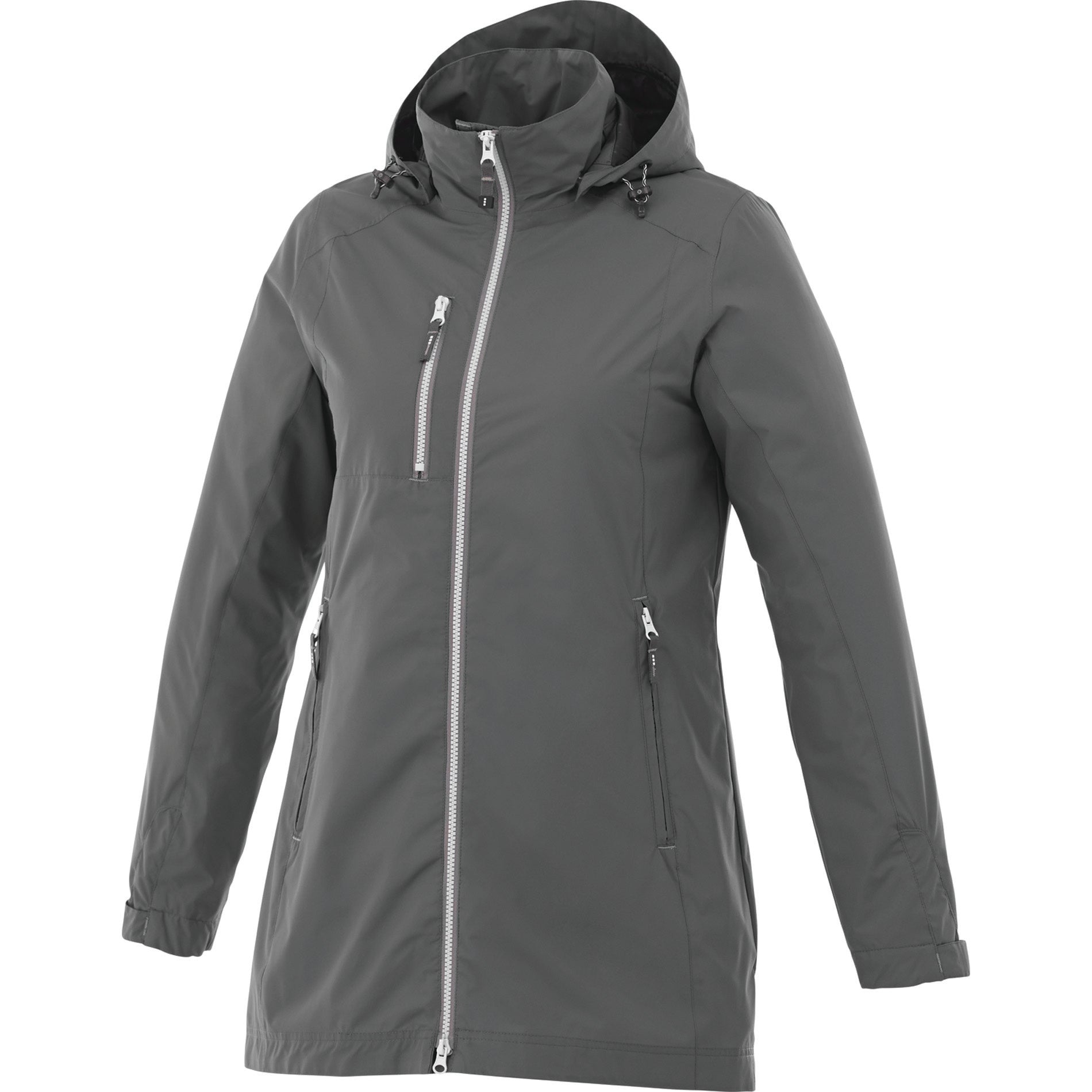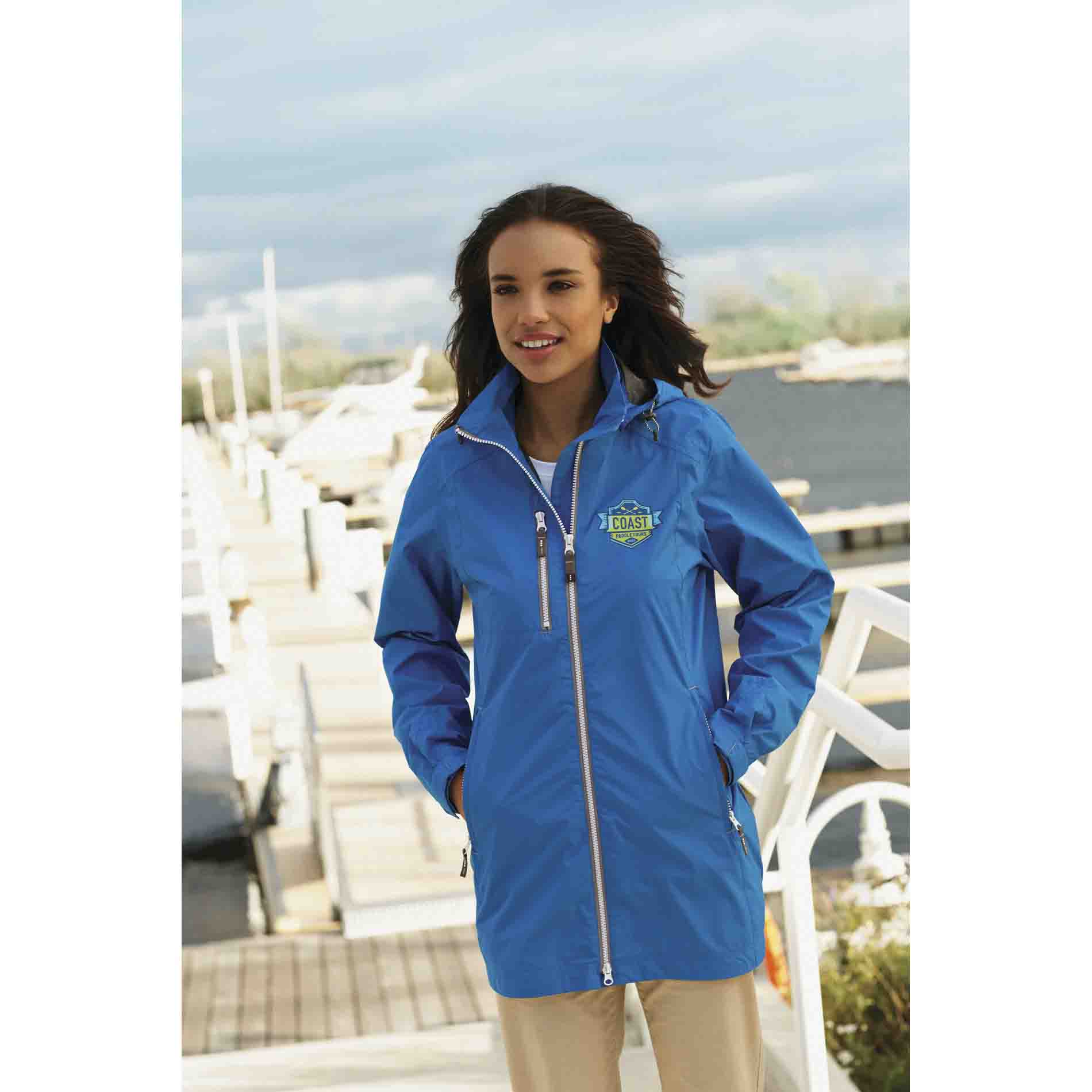 - This modernised rain jacket is designed with a detachable snap off hood featuring an eye-catching graphic drawcord, interior storm flap with rain gutter, zipper with contrast tape and white teeth, adjustable cuff tabs with velcro closure and dropped back hem