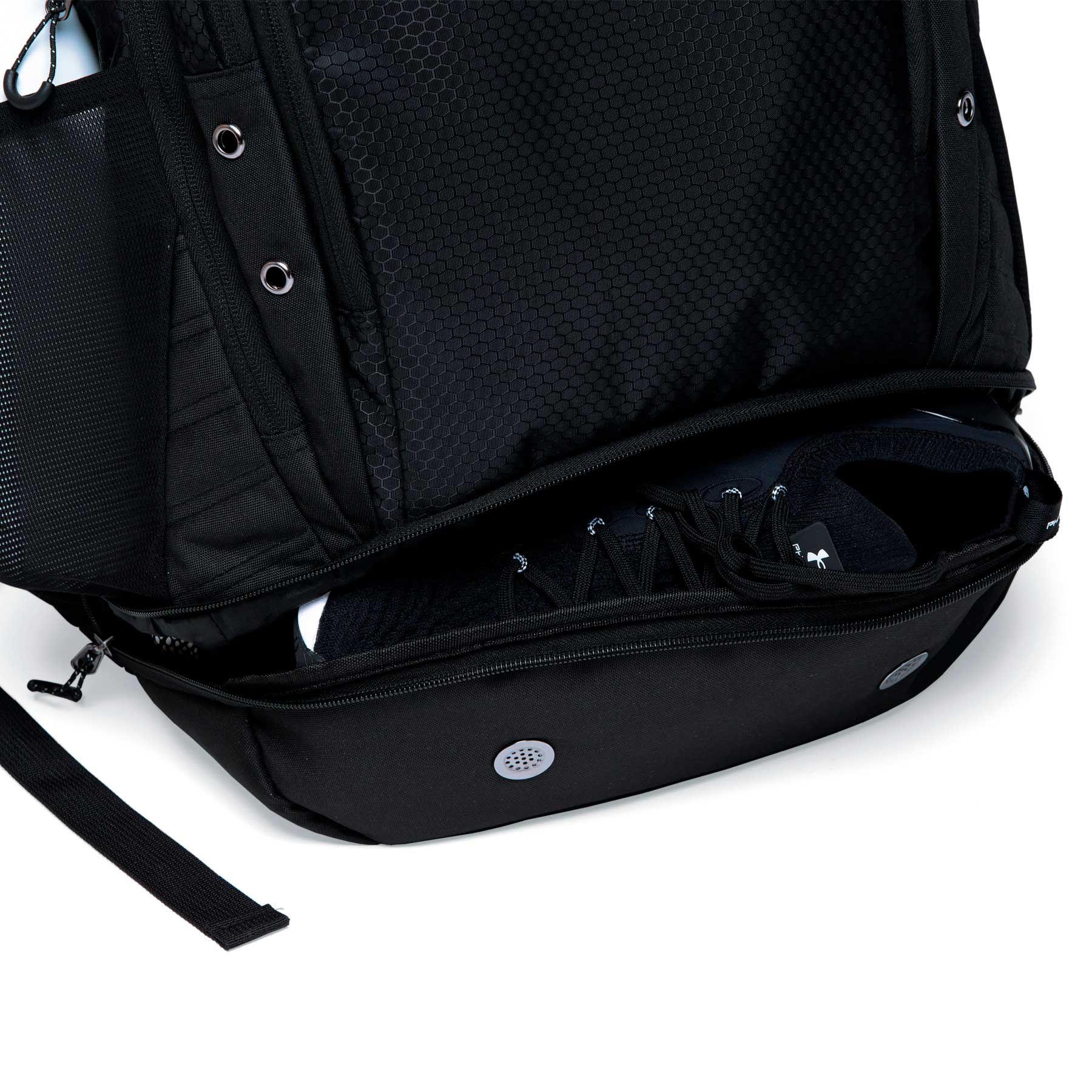- Zippered shoe compartment pocket at base with metal ventilation eyelets