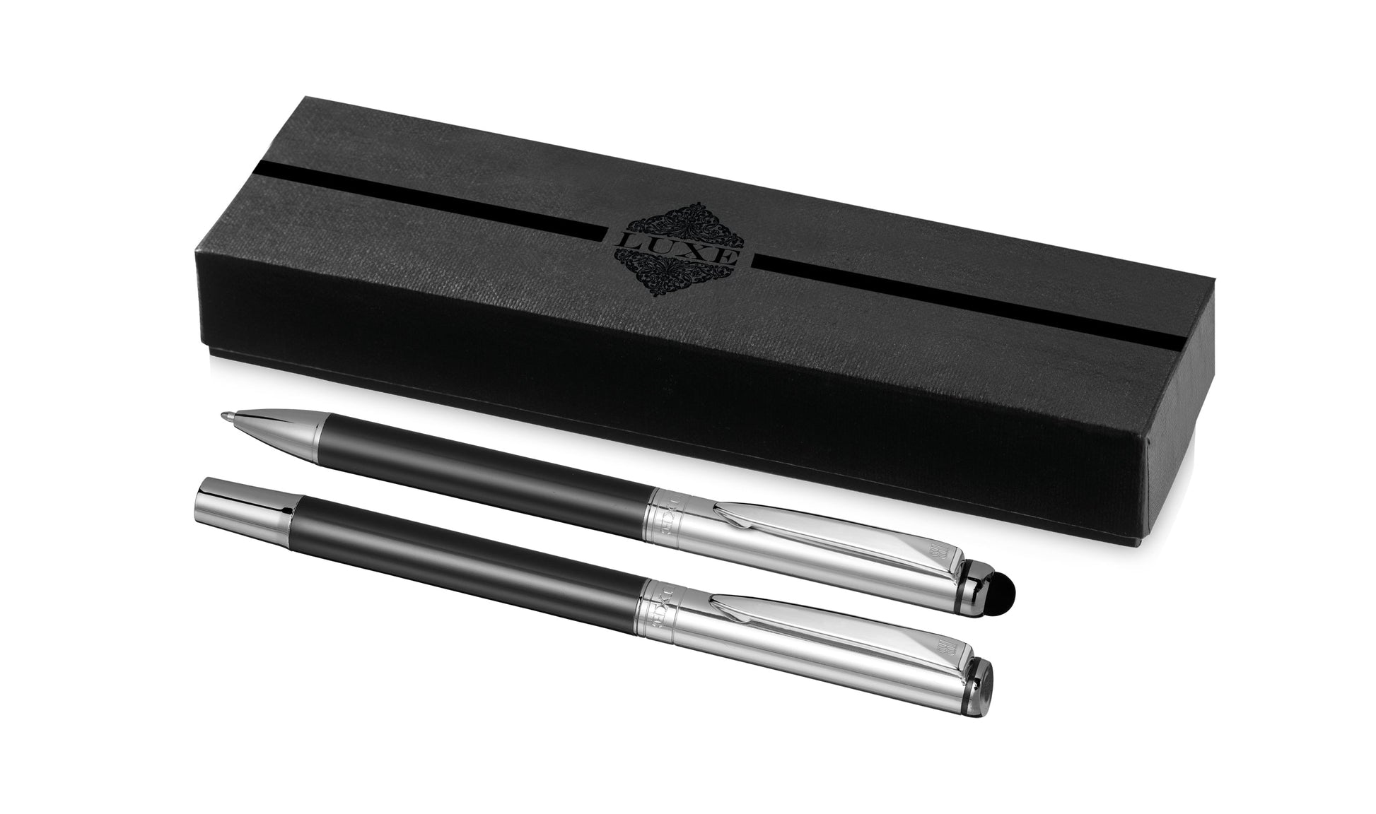 - Set includes: Roller ball pen with removable cap and Twist action ballpoint pen with rubberised stylus end